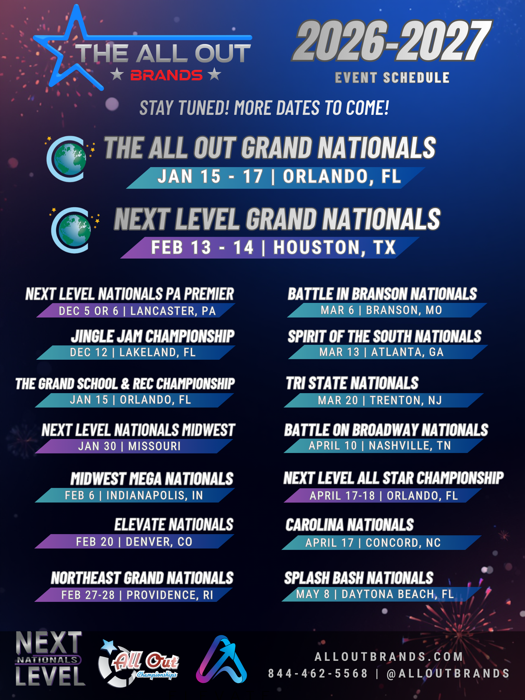 Next Level Nationals hosts camps and competitions throughout the country and is excited to see you and your team at our next event! Next Level Nationals is dedicated to bringing cheerleading and dance competitions to cities near you, providing an opportunity for teams to showcase their talent. Join us for an unforgettable experience and a chance to compete with some of the best teams in the nation.